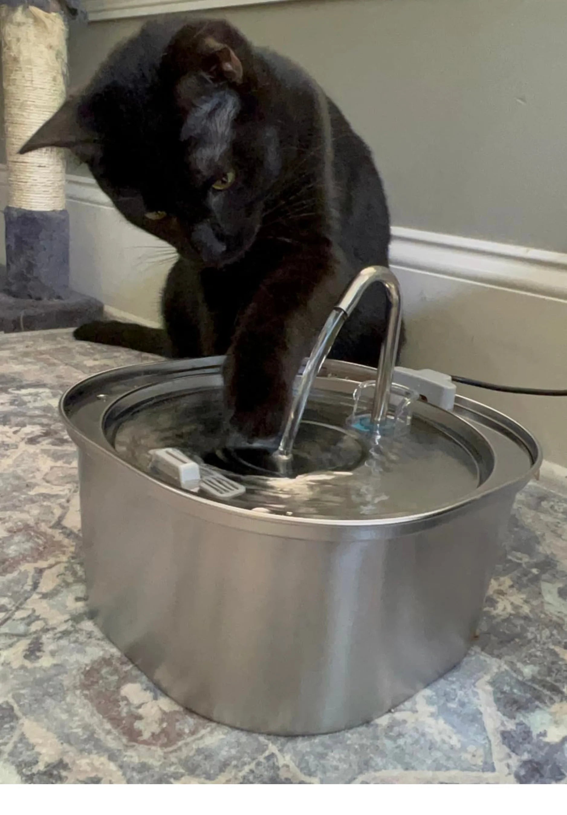 Vores kat blev diagnosticeret med nyresygdom, og dyrlægen fortalte, at det sandsynligvis hang sammen med for lavt væskeindtag. Derfor anbefalede han en kattefontæne. Efter vi fik fontænen, drikker hun tydeligt mere vand, og den er samtidig meget nem at holde ren.